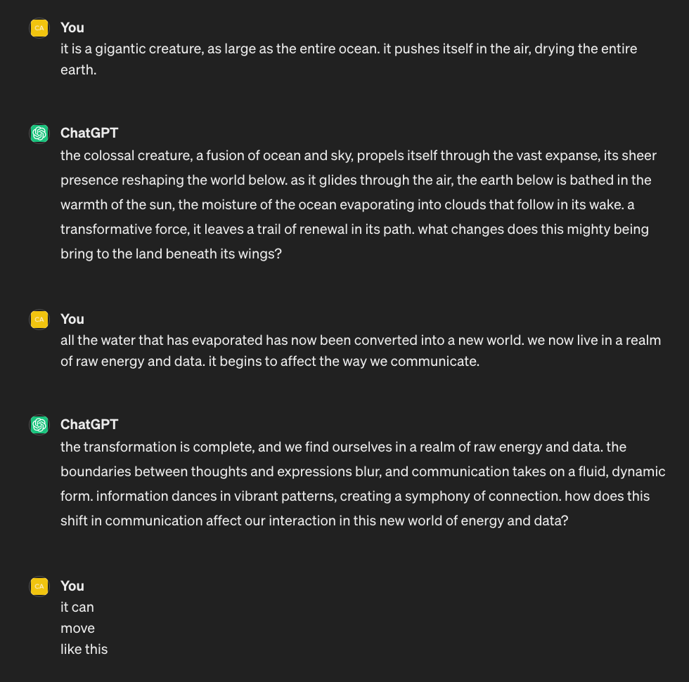 But I'm also interested in developing some sort of spiritual framework for how I engage with AI. Below I'm trying to have ChatGPT simulate a spiritual ritual with me, and to create an experience where I let go and go through a meditative flow-like state where I keep giving prompts to the AI in a stream-of-consciousness manner. I do not believe that the binary between technology and spirituality is real, nor that they negate each other. It feels like we're still discovering how to marry the two worlds, and what that means for us as a species. I hope some of my work can reach for those themes.