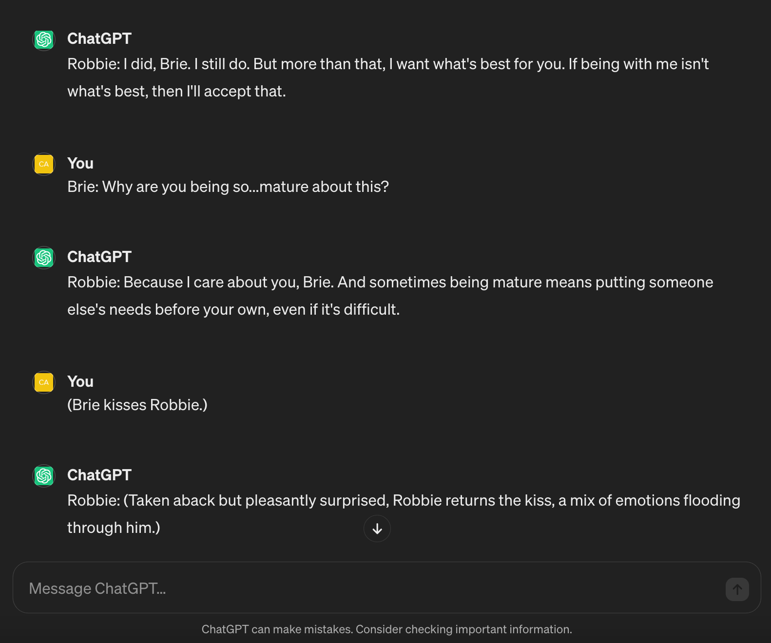 Currently, I've been playing around and doing some weird stuff with AI. Below is a screenshot from a romantic fanfic play I made with ChatGPT featuring political commentators Briahna Joy Gray and Robby Soave from The Hill. I've always felt like they were having a forbidden love affair off-camera, and they get so heated when they fight each other. It's as though the sexual tension between them could come to a boil at any moment. It's probably also a metaphor for our absurd political climate right now, but I can't be bothered to unpack that any further. If Briahna or Robby are reading this: If you want this off the internet, just shoot me an email!